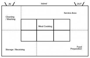 The island-style layout places the ovens, ranges, fryers, grills, and other principle cooking equipment together in one module at the center of the kitchen, while other sections of the kitchen are placed on the perimeter walls in the proper order to preserve a circular flow (any section can be the “island” depending on what best suits your needs). This layout is very open and promotes communication and supervision, while leaving plenty of open floor space for easy cleaning. This layout works best in a large kitchen that is square in shape, but can certainly be modified to fit other shapes and sizes.